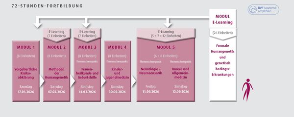 Mit Hilfe unseres Fortbildungsangebots können Sie diesen geforderten Qualifikationsnachweis zur „fachgebundenen genetischen Beratung“ erlangen. Die Fortbildung ist modular aufgebaut.